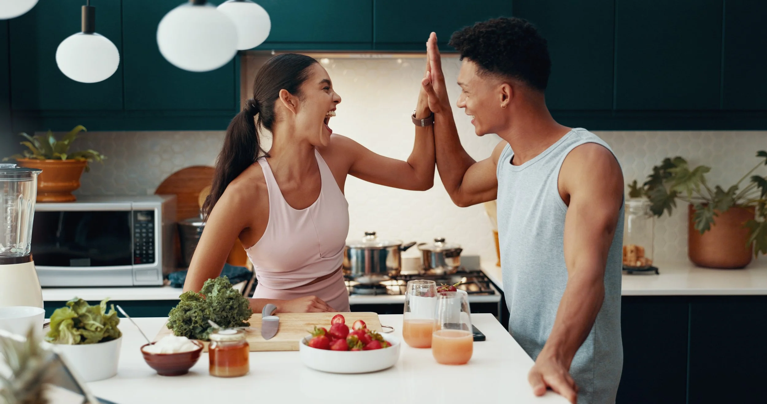 Adobe Stock. (n.d.). Kitchen cooking and happy couple high five for success, fitness goal or food for nutrition [Photograph]. Retrieved from https://stock.adobe.com/au/images/kitchen-cooking-and-happy-couple-high-five-for-success-fitness-goal-or-food-for-nutrition-woman-man-and-celebration-in-home-together-for-achievement-healthy-diet-or-excited-for-wellness-target/1231276882